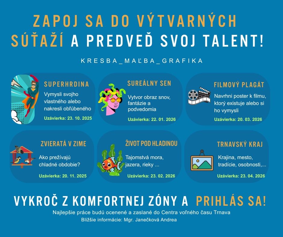 Naša škola sa zapája do výtvarných súťaží organizovaných Centrom voľného času v Trnave, kde môžeš predviesť svoju fantáziu a kreativitu. Neváhaj a pridaj sa – možno práve tvoja práca získa ocenenie!